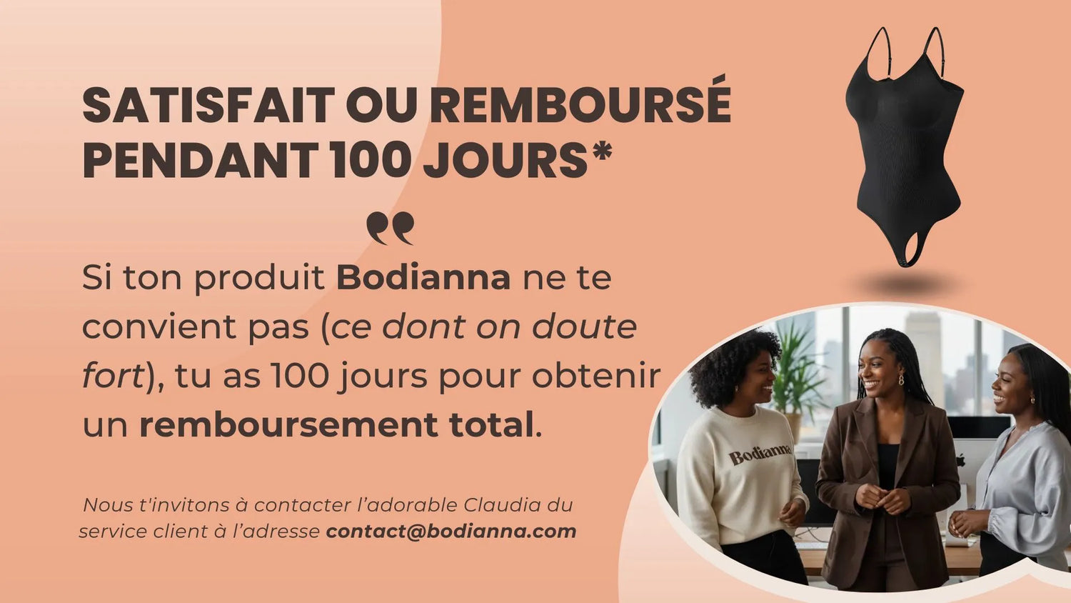 Si ton produit Bodianna ne te convient pas (ce dont on doute fort) , tu as 100 jours pour obtenir un remboursement total. Nous t'invitons à contacter l’adorable Claudia du service client à l’adresse contact@bodianna.com
